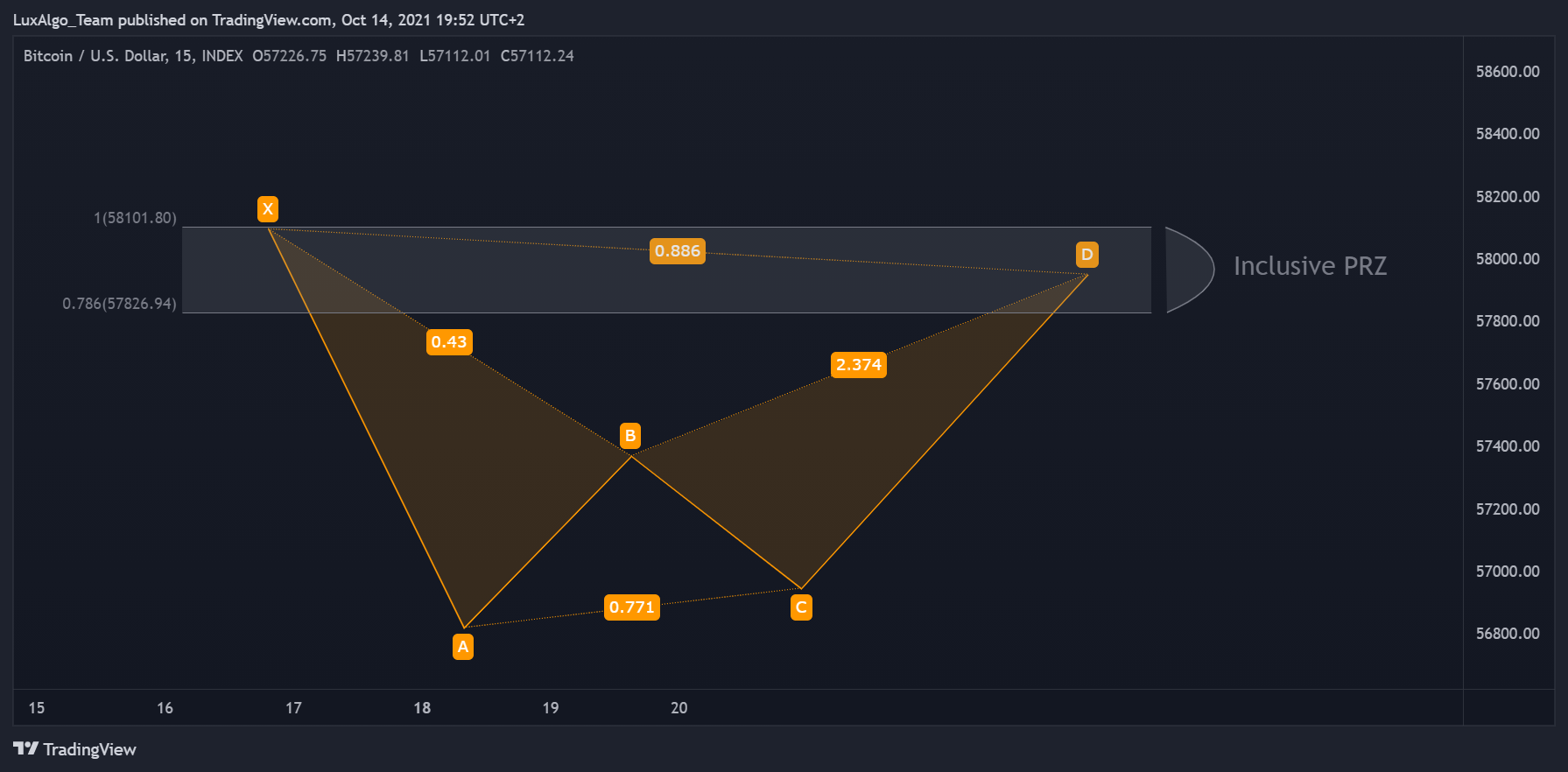A reversal is more likely to occur within the "potential reversal zone" (PRZ). Traders can have different methods for identification however Fibonacci retracements are commonly used, with an extremity of the PRZ located at 88.6% of the internal retracement of XA and another at 161.8% of BC . Another method identifies the PRZ within 78.6% and 100% of the internal retracement of XA.
