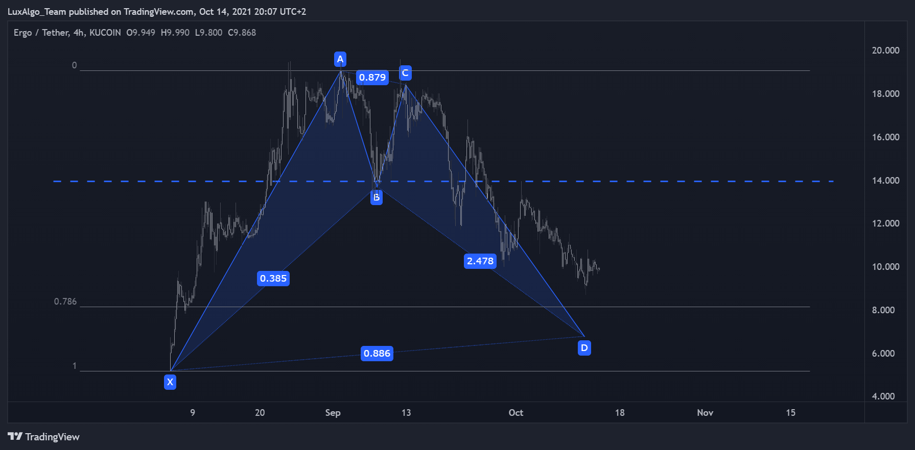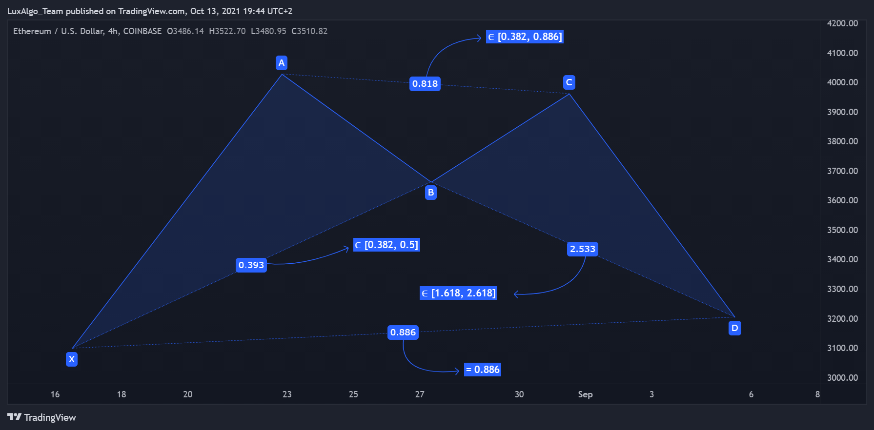 For the pattern to be valid, the vertex given by point C must be confirmed. It is also interesting to note that the bat pattern can possess an internal AB = CD pattern.
