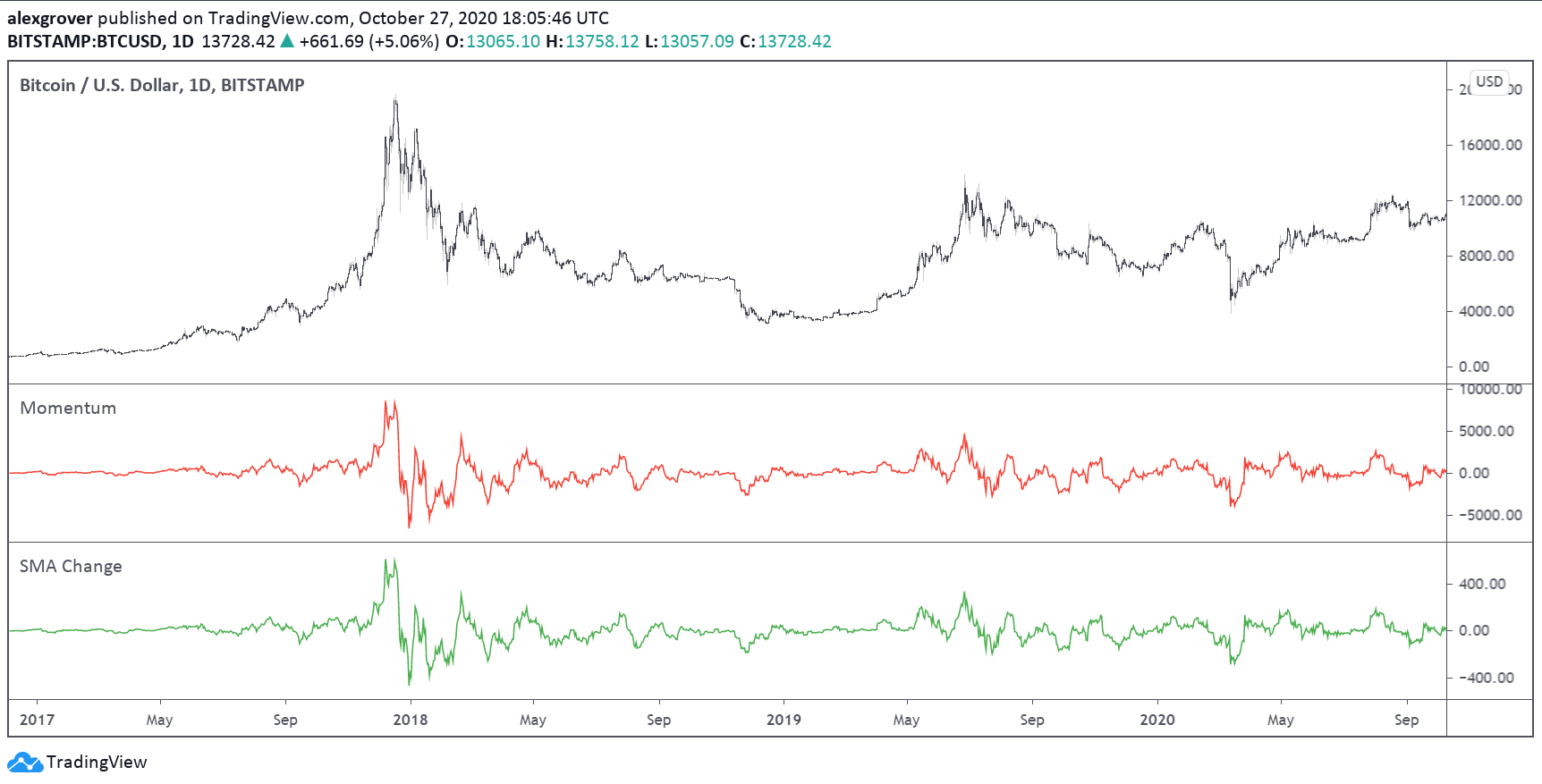 The goal of any good technical indicator is to give as much useful, easy to read/access, non redundant information to the user while minimizing interaction with the indicator settings. In theory, both should be correlated with more information requiring more interaction (using toggles/ drop down menus etc). The redundancy problem is a major one since it affects all the previously described goals of a good indicator. Let’s take the momentum oscillator as an example: This oscillator has many interesting properties, it can determine the current trend, show divergences, but can also determine the sign of the changes in a simple moving average of the same period.
